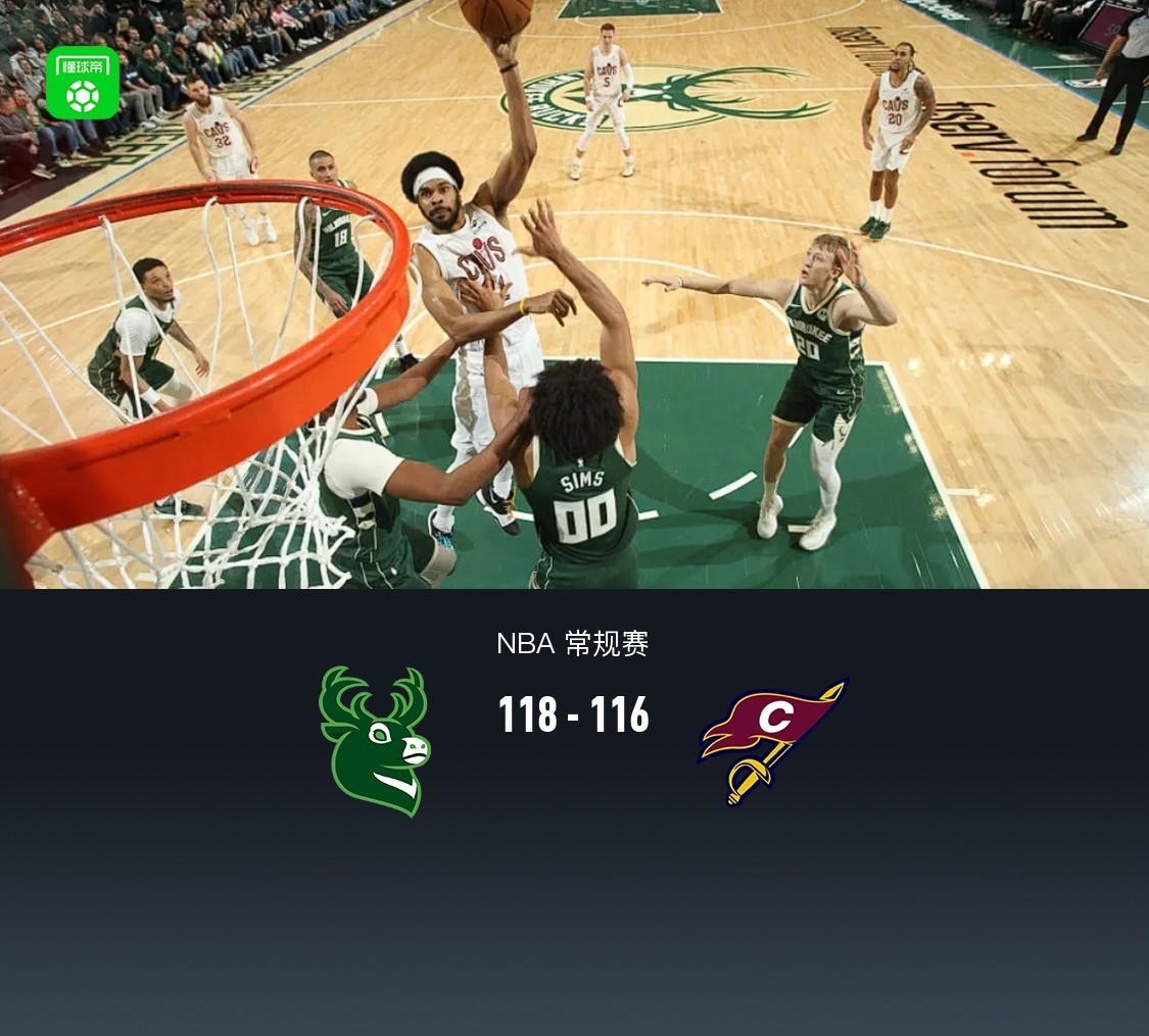 第四节雄鹿西姆斯拿下7分,骑士艾伦拿下7分,最终雄鹿118-116战胜骑士