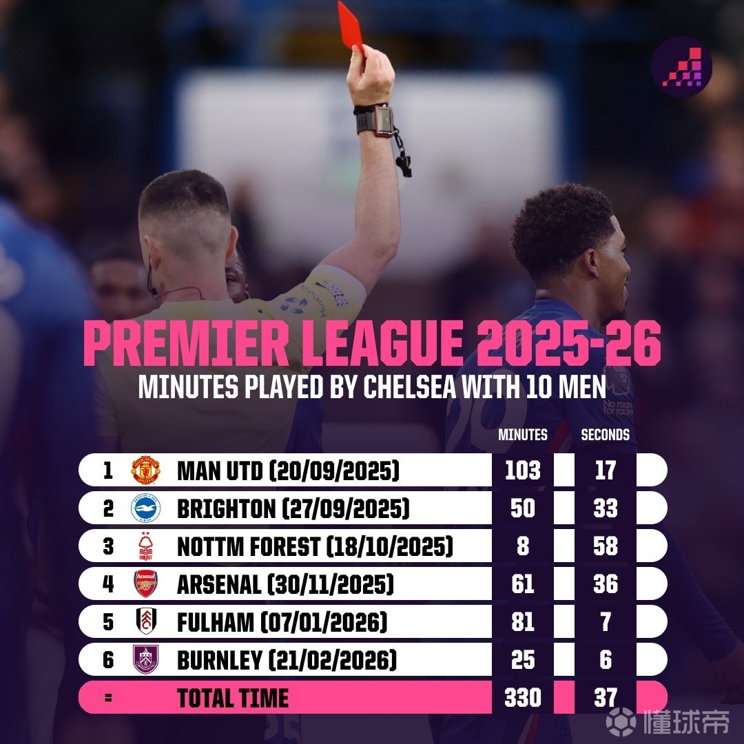 由于本赛季领到了6张红牌,切尔西在英超联赛中十人作战累计时长为330分钟37秒,为所有球队最多。